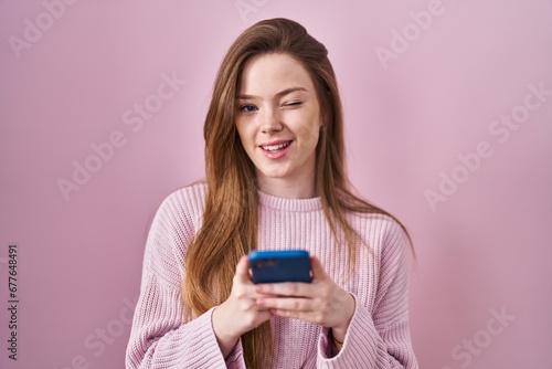 Young caucasian woman using smartphone typing message winking looking at the camera with sexy expression, cheerful and happy face.
