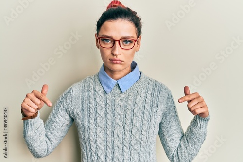 Young caucasian woman wearing casual clothes and glasses pointing down looking sad and upset, indicating direction with fingers, unhappy and depressed.