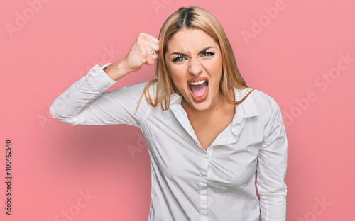 Young caucasian woman wearing casual clothes angry and mad raising fist frustrated and furious while shouting with anger. rage and aggressive concept.
