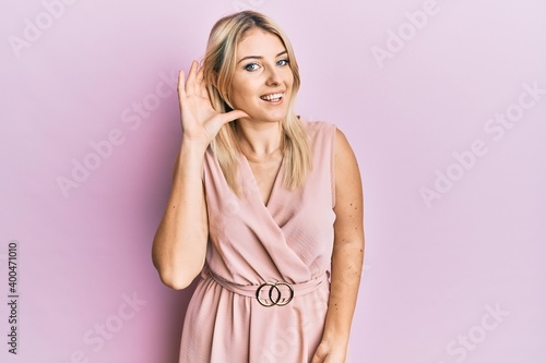 Young caucasian woman wearing casual clothes smiling with hand over ear listening and hearing to rumor or gossip. deafness concept.