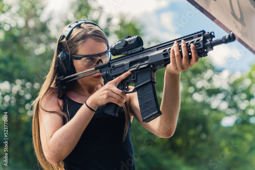 Young caucasian woman wearing protective goggles and headphones practising with submachine gun on outdoor shooting range. Horizontal shot. High quality photo