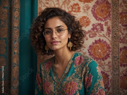 Young Caucasian woman with curly brown hair, wearing glasses and colorful floral print dress, standing in front of patterned wall