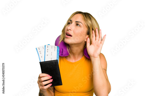 Young caucasian woman with inflatable travel pillow holding passport isolated on green chroma background trying to listening a gossip.