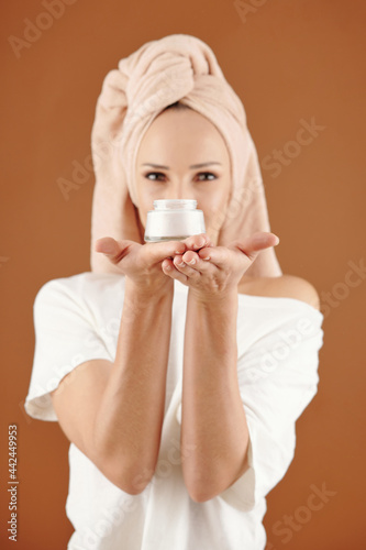 Young Caucasian woman with towel on hair holding cream jar on palms while presenting it against brown background