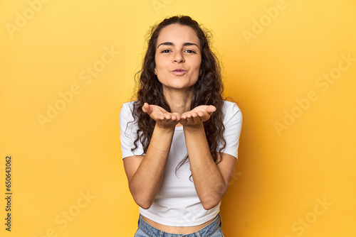 Young Caucasian woman, yellow studio background, folding lips and holding palms to send air kiss.