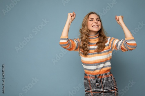 Young charming fascinating sexy positive happy smiling blonde woman wearing casual striped pullover isolated over blue background with free space and celebrating winning. Victory concept