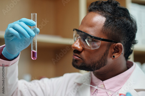 Young chemist in gloves, eyeglasses and lab coat looking at flask containing liquid substance while studying its characteristics