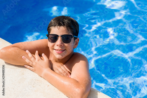 Young child on holiday at the swimming pool by the beach with a happy face standing and smiling with a confident smile showing teeth