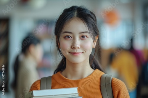 Young Chinese female teacher holding a stack of books, smiling at the camera in a classroom