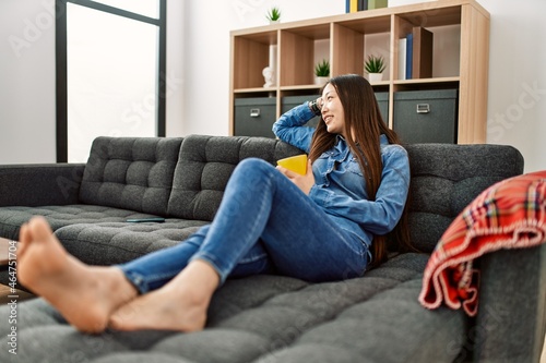 Young chinese girl drinking coffee lying on the sofa at home.