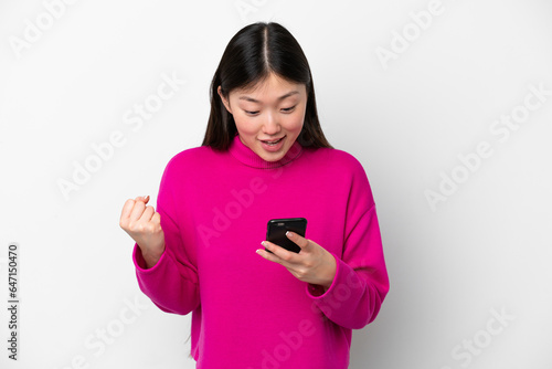 Young Chinese woman isolated on white background surprised and sending a message