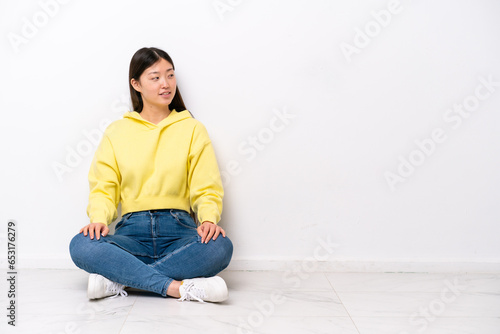 Young Chinese woman sitting on the floor isolated on white wall looking side