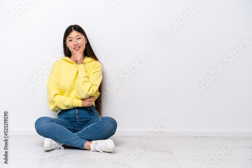 Young Chinese woman sitting on the floor isolated on white wall smiling