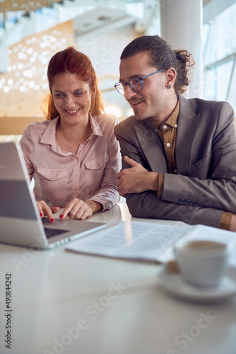 Young colleagues sitting at the desk and watching a laptop content together. Business, people, company