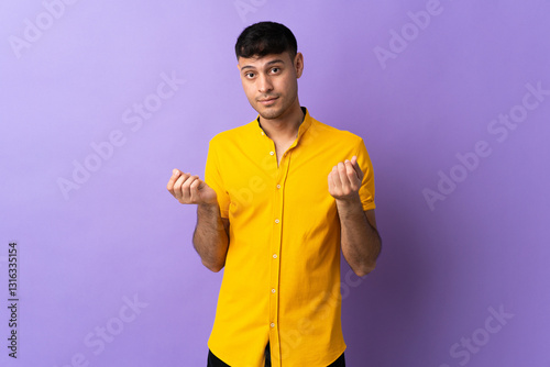 Young Colombian man isolated on purple background making money gesture but is ruined