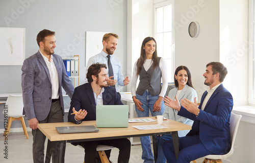 Young confident happy smiling people group of company employees talking on business meeting sitting in modern office during a conference, discussing new job projects or startups. Teamwork concept.