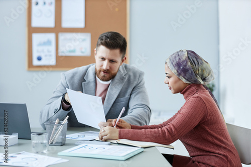 Young confident male economist explaining data in financial document to female colleague while discussing working points at meeting in office