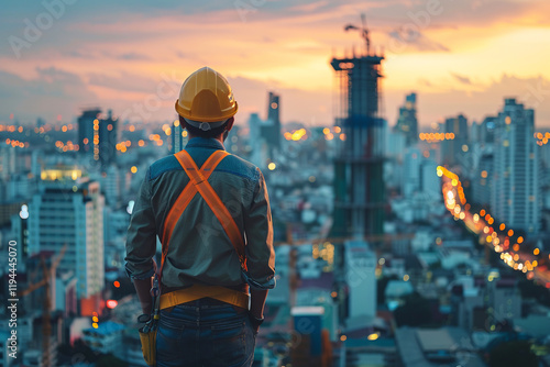 Young construction worker stands on a high-rise building, showcasing urban skyline behind him.