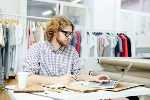 Young contemporary designer sitting in studio with laptop in front and making sketches in notebook
