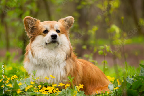 Young Corgi Female Dog In Spring Forest. Close Up Portrait of Cute Fluffy Corgi Dog in a spring nature landscape.