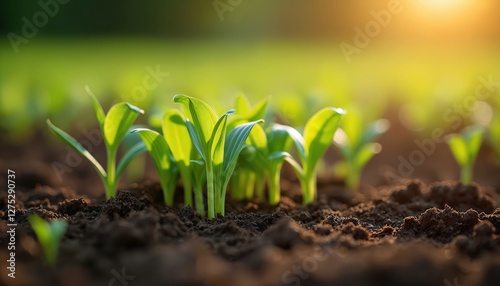 Young corn seedlings grow in soil at sunlight. Cornfield cultivation. Germinating maize sprouts in springtime. Agricultural field background. Farm fertile dirt ground. New harvest plant.