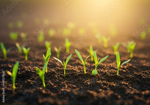 Young Corn Sprouts in Fertile Soil, Illuminated by Golden Sunlight Agriculture and Growth.