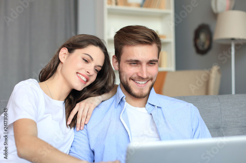Young couple doing some online shopping at home, using a laptop on the sofa.