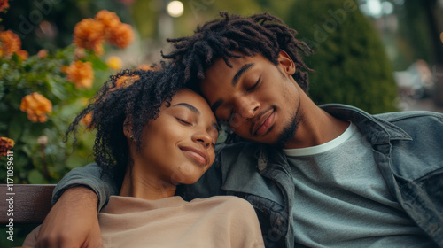 Young couple enjoying a peaceful moment together on a park bench, embodying love and tranquility in nature.