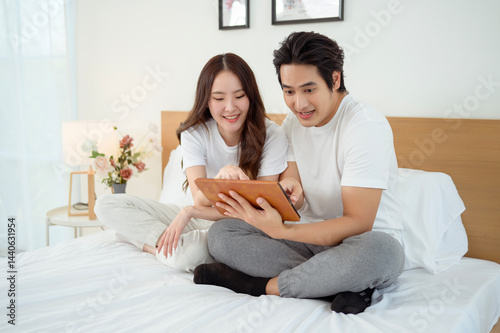 Young Couple Enjoying Leisure Time Together While Viewing Content on a Tablet in Their Cozy Bedroom