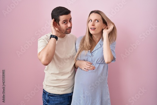 Young couple expecting a baby standing over pink background smiling with hand over ear listening an hearing to rumor or gossip. deafness concept.