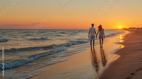 Young Couple Holding Hands Walking on the Beach at Sunset