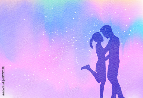 Young couple in love silhouette on watercolor background. Romantic scene. Digital art painting.