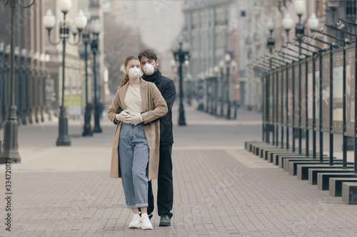Young couple in love in the empty streets in medical masks. Virus protection concept