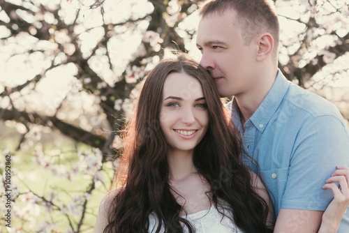 Young couple in love outdoor.Stunning sensual outdoor portrait of young stylish fashion couple posing in spring near blossom tree
