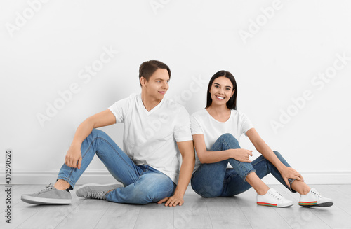 Young couple in stylish jeans sitting near white wall