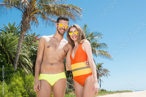 Young couple in swimsuits in the morning sun in a coastal area