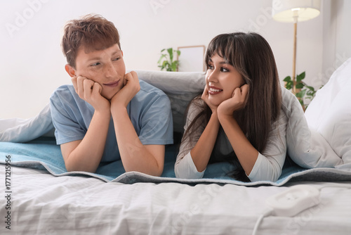 Young couple lying on electric heating pad in bedroom