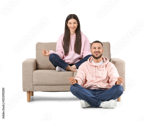 Young couple meditating on grey sofa against white background