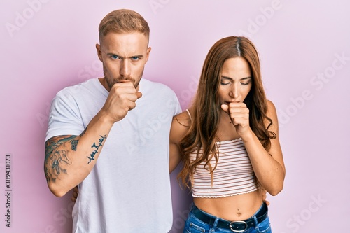 Young couple of girlfriend and boyfriend hugging and standing together feeling unwell and coughing as symptom for cold or bronchitis. health care concept.