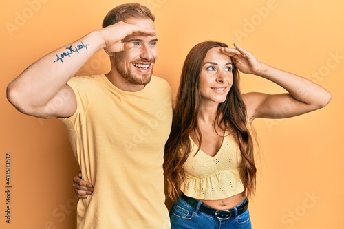 Young couple of girlfriend and boyfriend hugging and standing together very happy and smiling looking far away with hand over head. searching concept.