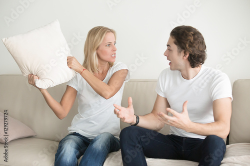Young couple quarrelling emotionally at home, woman is attacking with a pillow, man is puzzled, arguing on family budget, who earns most, unwilling to help about the house. Family problems concept