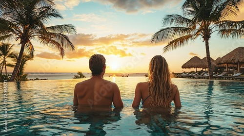 Young Couple Relaxing by Pool at Tropical Resort Hotel with Palm Trees at Sunset, Summer Vacation Concept