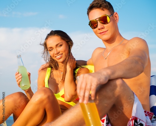 Young couple relaxing on a deck chairs on a beach