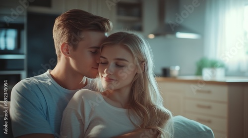 Young couple sitting on couch. Man is fair-haired girl who is a good-looking man on a couch. Slow motion of tender kiss in the field. A youthful pair relaxing on lifestyle a sofa.