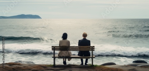 young couple sitting on white sand beach on paradise island