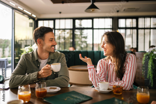 Young couple sitting together in a cozy café, enjoying coffee and engaging in a warm conversation.