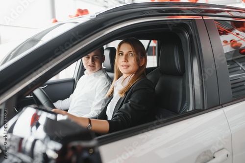 Young couple smiling at auto showroom