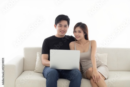 Young Couple Smiling Together While Using Laptop in Modern Living Room