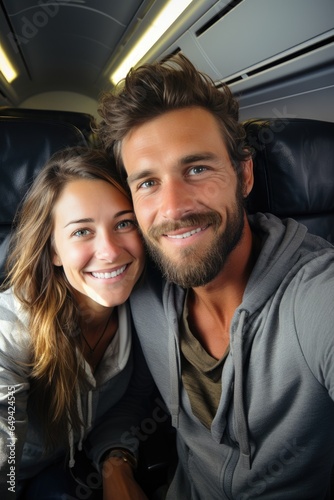 Young couple taking a selfie on the airplane during flight around the world. Generative AI
