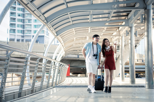 Young couple with dragging a suitcase and talking while to travel in the city.